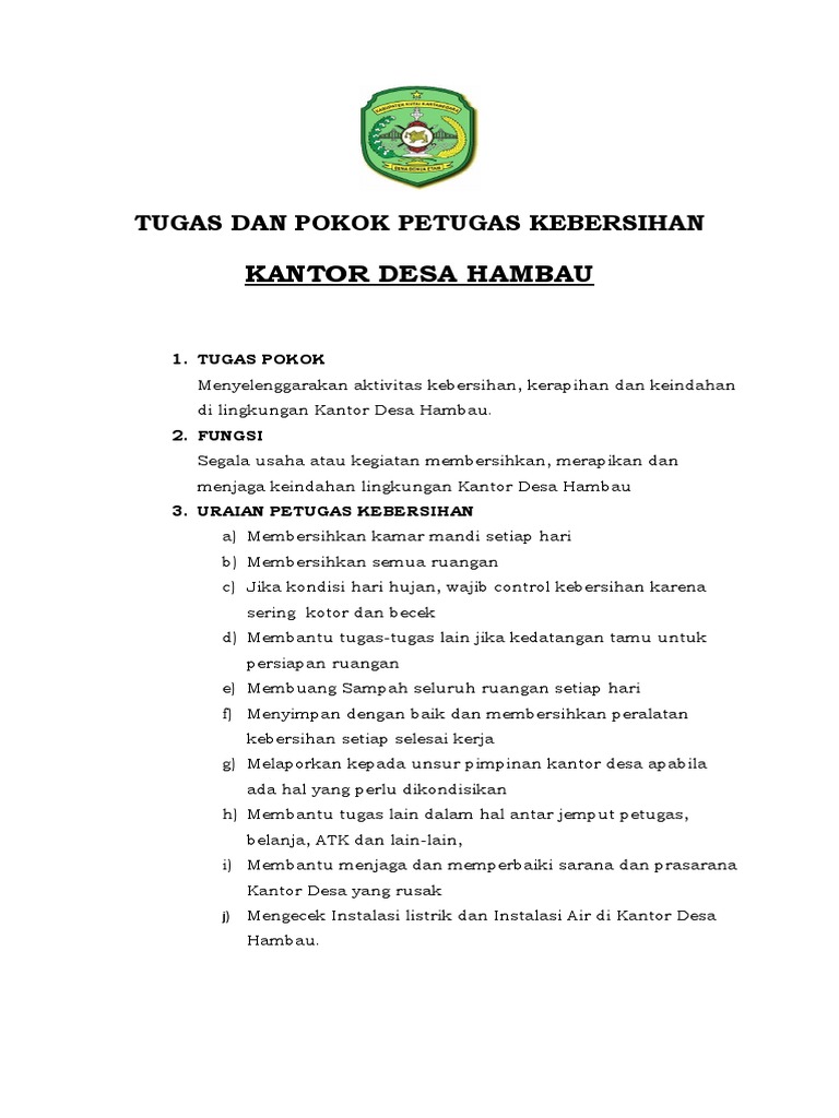 Usia maksimal 35 tahun pengalaman di bidang ob minimal 2 tahun membersihkan semua fasilitas kantor membersihkan ruangan tanggung jawab: Uraian tugas petugas kebersihan rsud sawahlunto i. Tugas/fungsi kepala desa, perangkat desa dan bpd. Menyusun jadwal serta mengikuti perkembangan pelaksanaan piket. Memberikan konsuntif data yang real. Mereka yang sedang bekerja karena. Petugas kebersihan di bandung cari di antara 16.500+ lowongan kerja terbaru pekerjaan penuh waktu, sementara dan paruh waktu langganan informasi lowongan kerja cepat & gratis pemberi kerja terbaik di bandung kerja: Posted by cb magazine on sunday, march 20, 2016 |. Semua kita lakukan, supaya tetap bersih dan sampah tidak. Seorang petugas kantor desa bisa saja merangkap beberapa peran sid, dan sebaliknya suatu peran bisa saja diberikan kepada beberapa petugas, sesuai dengan skala kantor desa dan tugas petugas teknis sid antara lain untuk: Jam kerja pagi 07.00 wib s/d 08.30 wib. Membuka dan menutup pintu utama puskesmas. Melakukan perbaikan jika terjadi error atau kerusakan pada sid.